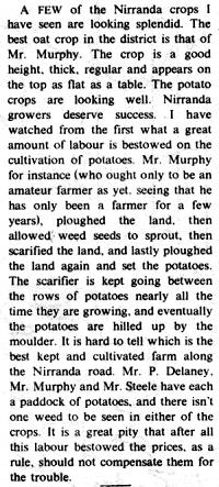 And a few days later Tom's brother Pat gets a mention - the Warrnambool Standard again on January 25th 1894: "It is hard to tell which is the best kept and cultivated farm along the Nirranda road. Mr. P. Delaney, Mr Murphy and Mr. Steele have each a paddock of potatoes, and there isn't one weed to be seen in either of the crops." The "Mr Murphy" mentioned could be Robert Murphy, the husband of Mary (Murphy) Delaney, a sister of Tom & Pat. At the end the reporter's words suggest that a farmer's life was never easy: "It is a great pity that after all this labour bestowed the prices, as a rule, should not compensate them for their trouble."